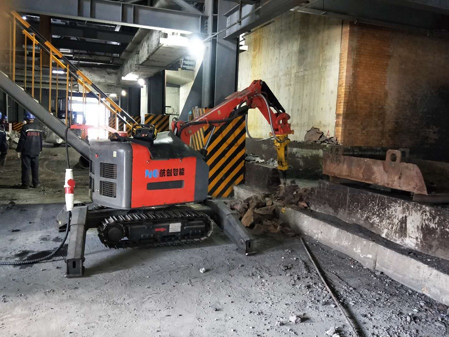 破拆機器人在銅鉛鋅企業(yè)可用來清陽極爐口,修澳爐,清理PS轉(zhuǎn)爐內(nèi)襯和余熱鍋爐清灰。在底吹和側(cè)吹爐煉銅廠用來清理爐口、煙道和溜槽,遙控作業(yè),操作安全,提高爐窯利用率。